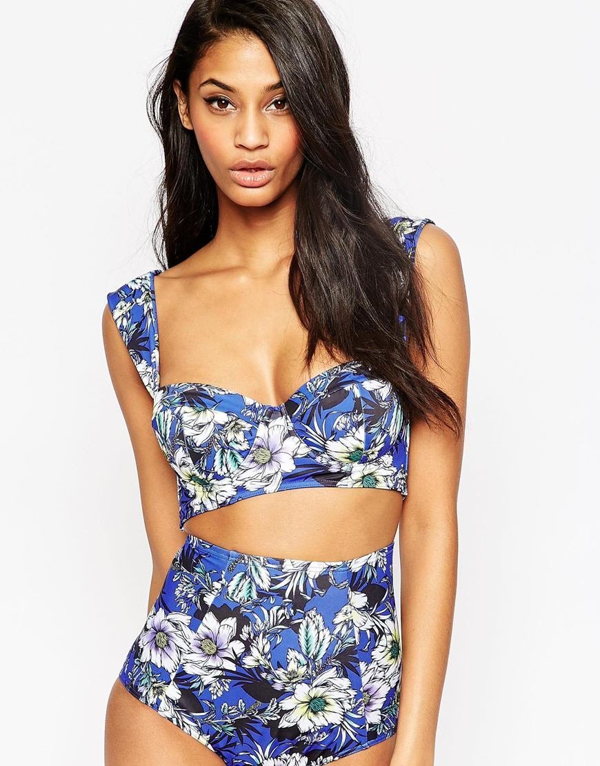 - Купальники с яркими принтами, оборками и прочими женственными деталями придают объем бёдрам и груди, а также делают талию тоньше.