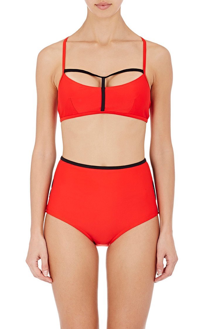 - Яркие цветовые акценты, как и купальники в ретро-стиле с завышенной талией и верхом с высоким вырезом, отлично вам подойдут.