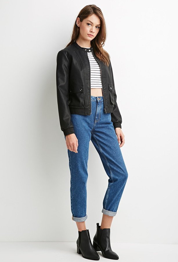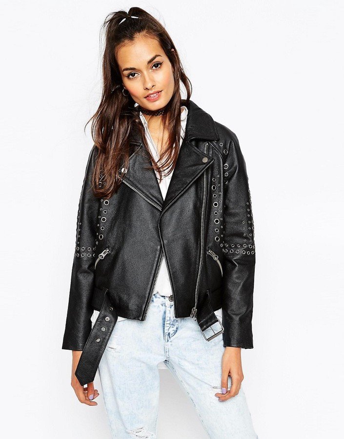 Треугольный воротник и широкий ремень на пряжках — стиль байкерской куртки (или, как её ещё называют, косухи). Если же вы предпочитаете что-то более женственное, обратите внимание на кожаный бомбер с резинкой на талии и меньшим количеством деталей.